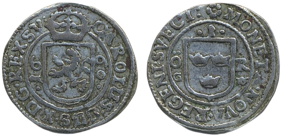 Coins, Sweden. Karl X Gustav, SM 33, 1 öre 1660. 1.15 g. Stockholm. Legend REGENI on reverse. Scarce spelling variety. 1/1+.