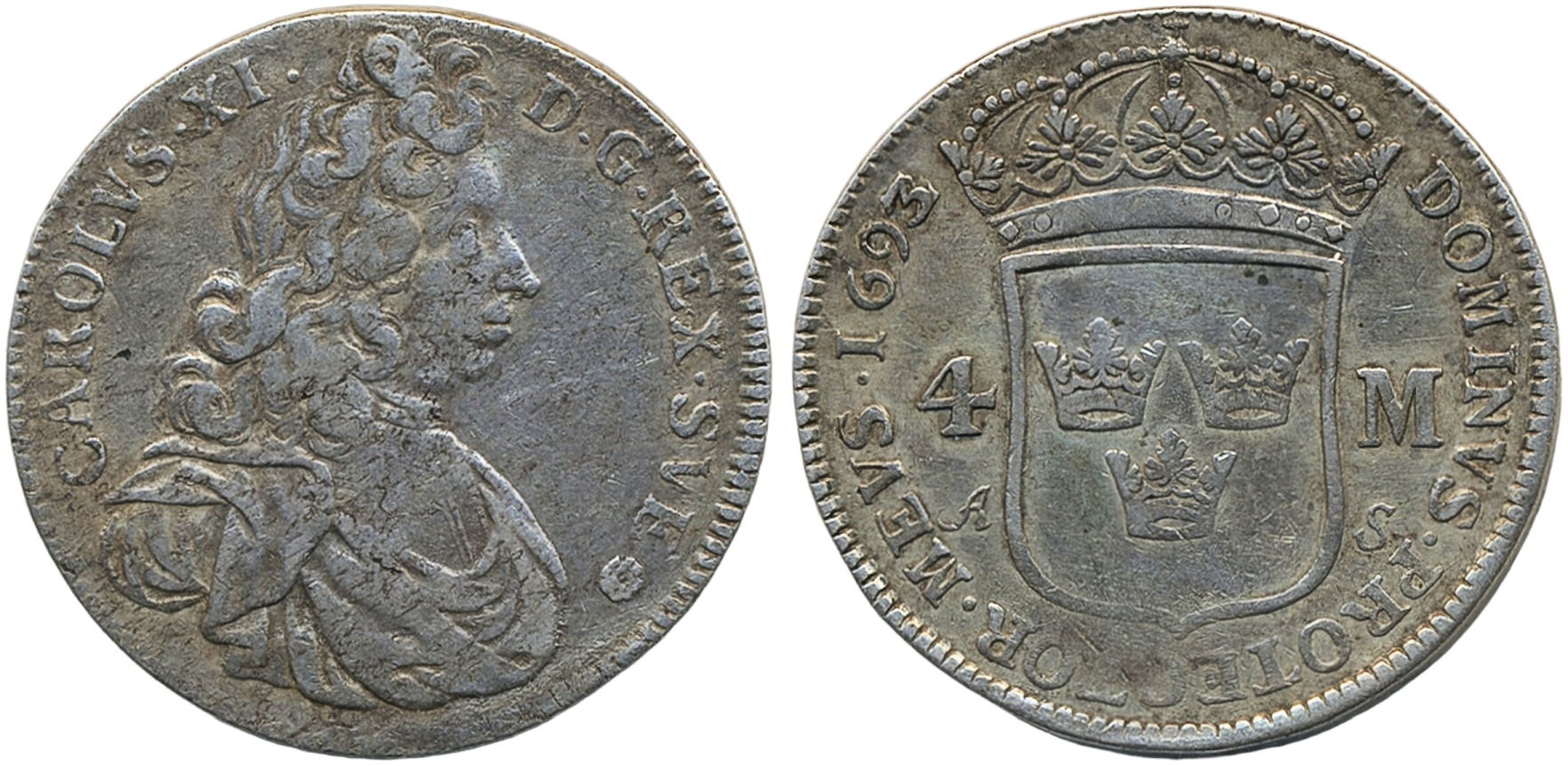 Coins, Sweden. Karl XI, SM 87, 4 mark 1693/2. 20.67 g. Stockholm. SMB 57. 1/1+.