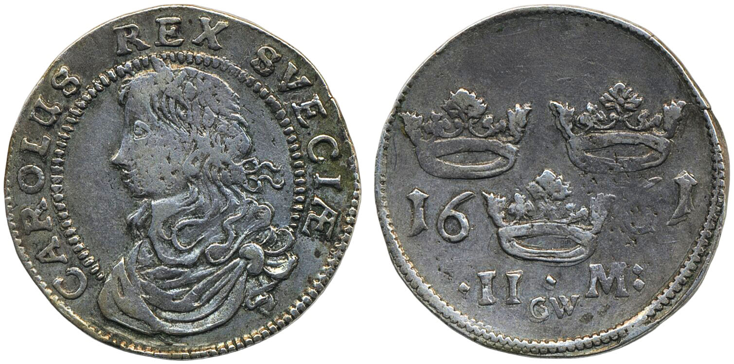 Coins, Sweden. Karl XI, SM 91, 2 mark 1661. 10.27 g. Stockholm. Some porosity in planchet. Scarce one year type! 1+.