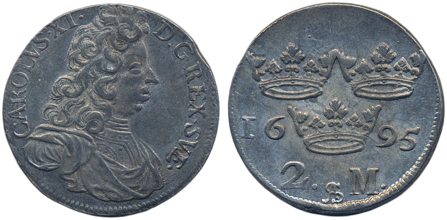 Coins, Sweden. Karl XI, SM 156, 2 mark 1695. 10.29 g. Stockholm. Much underlying lustre, minor edge clip from production. 01.