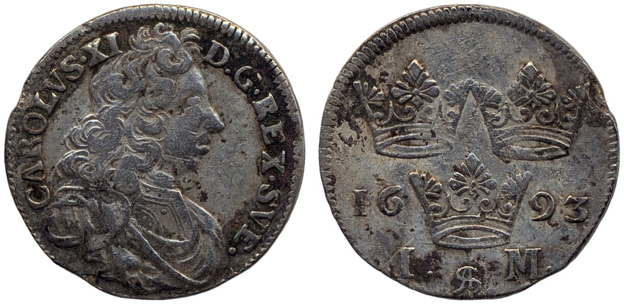 Coins, Sweden. Karl XI, SM 184, 1 mark 1693. 5.05 g. Stockholm. Cleaned, planchet flaw at edge. 1.