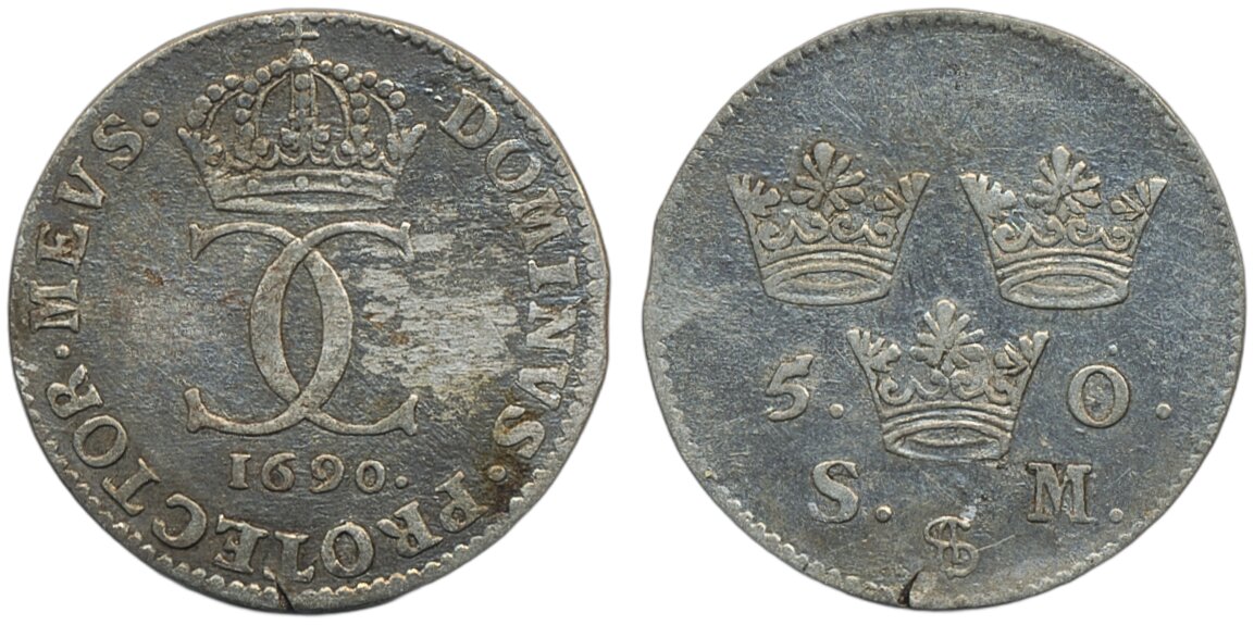 Coins, Sweden. Karl XI, SM 189 var, 5 öre 1690. 3.41 g. Stockholm. Struck on planchet size for 4 öre. Minor planchet flaw at edge. SMB 293. 1+.