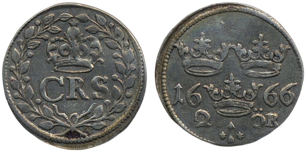 Coins, Sweden. Karl XI, SM 216e, 2 öre 1666. 1.86 g. Stockholm. Crown type H2\/11. Göhle 229. 1+/01.