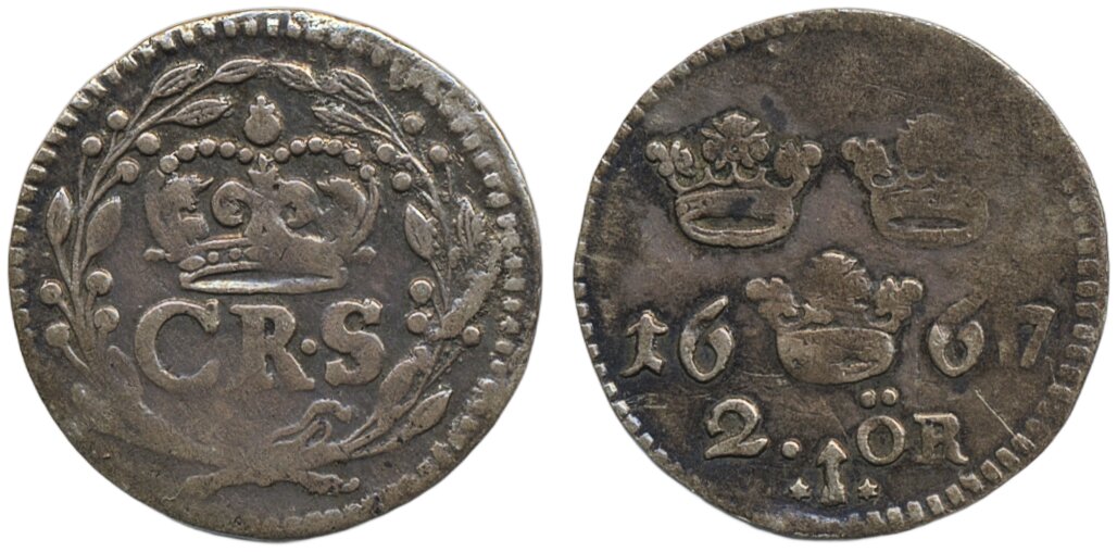 Coins, Sweden. Karl XI, SM 217b, 2 öre 1667. 1.29 g. Stockholm. Somewhat weakly struck. Göhle 332. 1+.