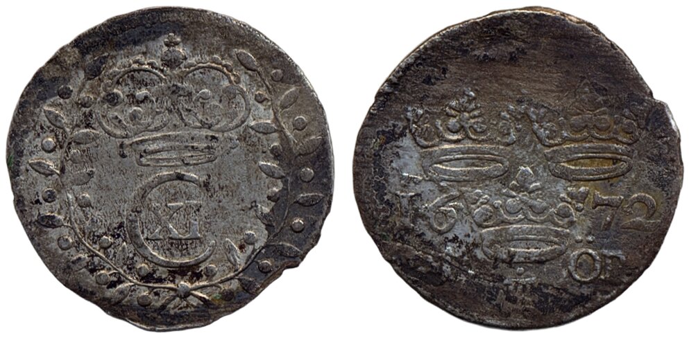 Coins, Sweden. Karl XI, SM 232a, 1 öre 1672. 1.04 g. Stockholm. Somewhat irregular planchet. 1+.