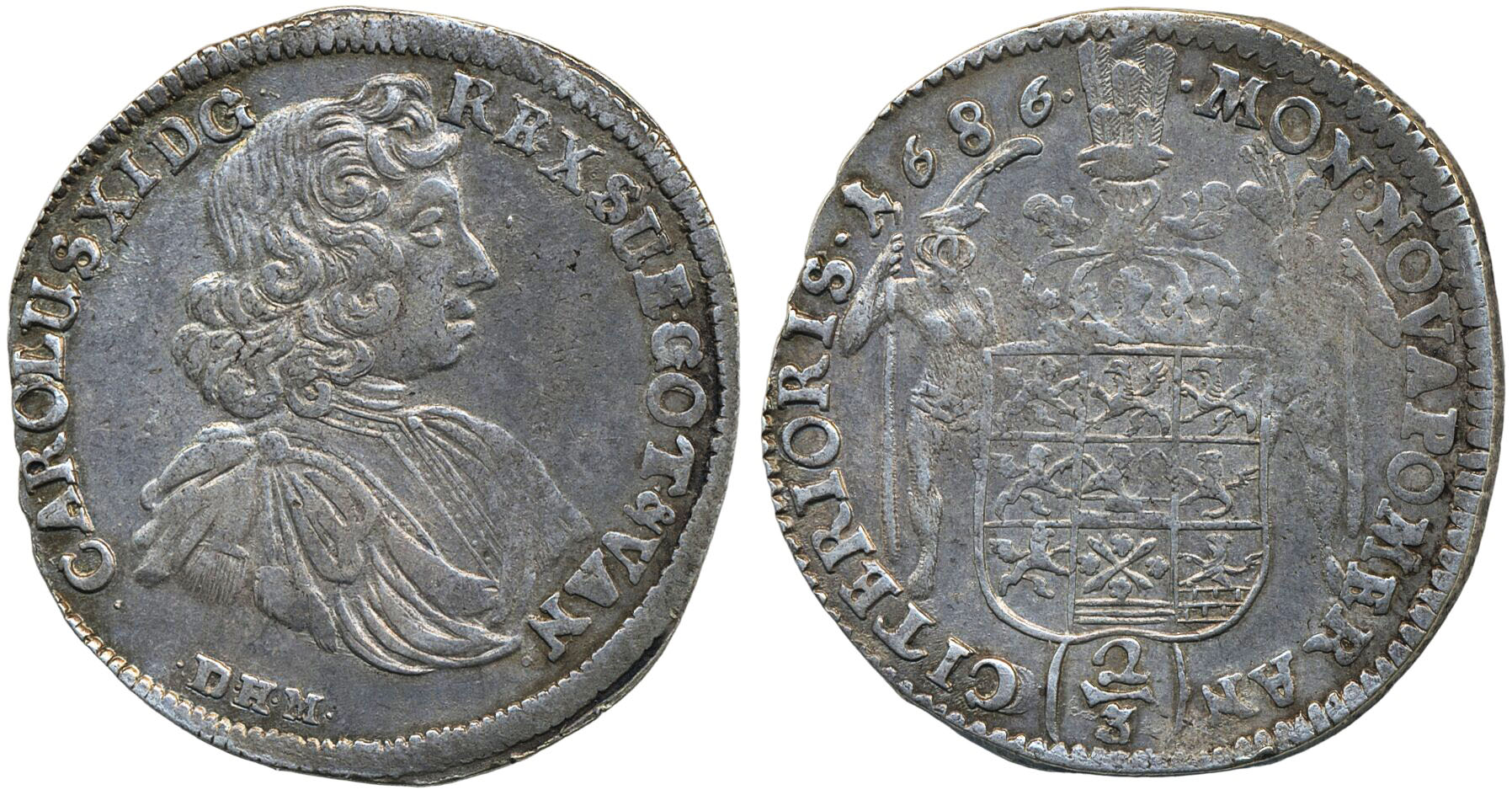 Coins, Swedish possessions, Pomerania. Karl XI, SB 105, 2/3 taler 1686. 17.40 g. Stettin. SMB 782. 1+.