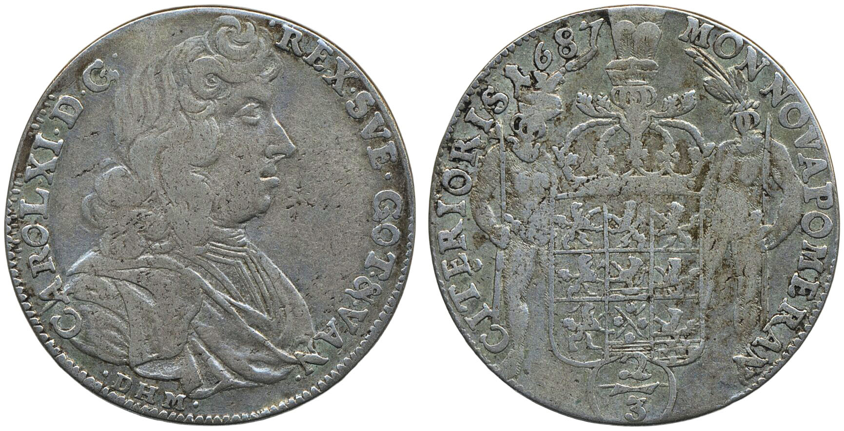 Coins, Swedish possessions, Pomerania. Karl XI, SB 109, 2/3 taler 1687. 14.48 g. Stettin. SMB 784. 1/1+.