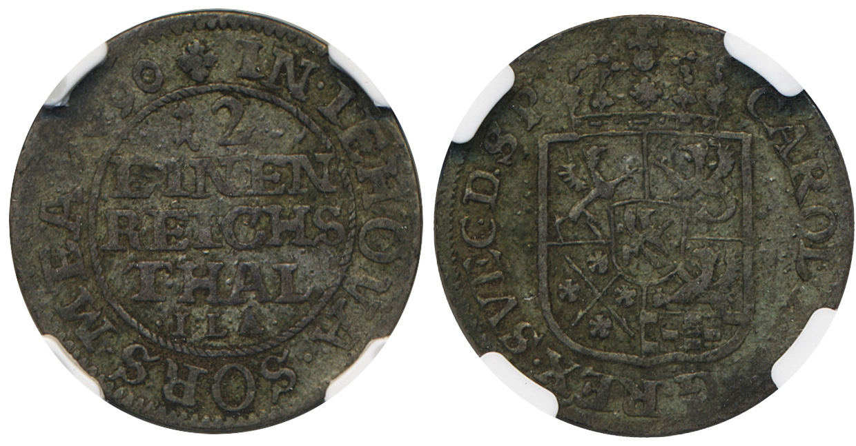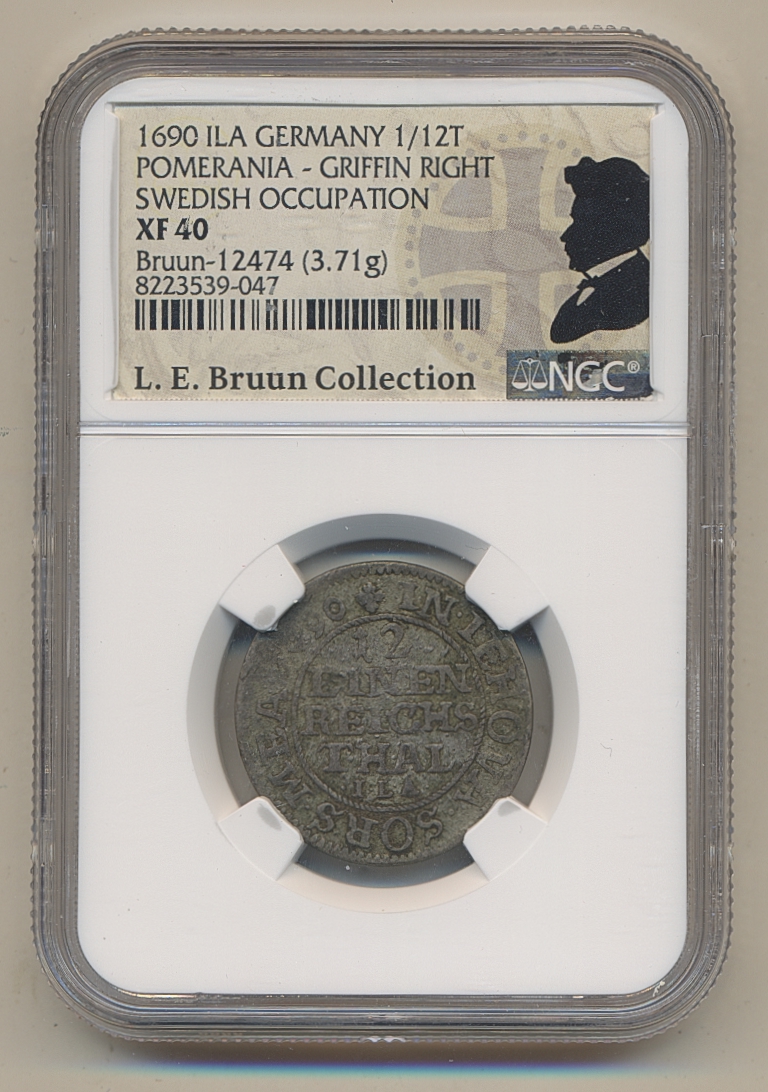 Coins, Swedish possessions, Pomerania. Karl XI, SB 149a, 1/12 taler 1690. 3.71 g. Stettin. Ex. Bruun. Graded by NGC as XF40. SMB 846. 1+. See certification at NGC