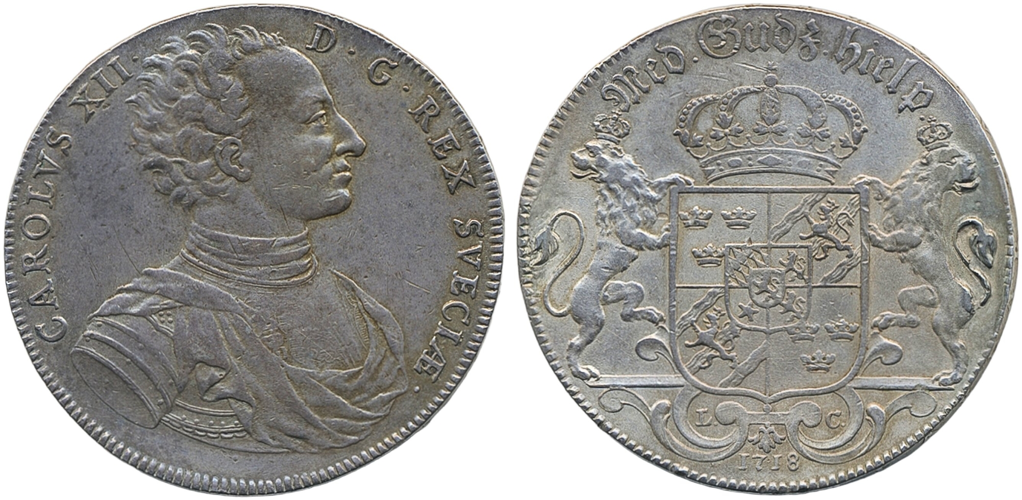 Coins, Sweden. Karl XII, SM 29a, 1 riksdaler 1718. 29.13 g. Stockholm. Small scratches, has possibly been mounted on reverse?, otherwise a beautiful example with a smooth patina. 1+.
