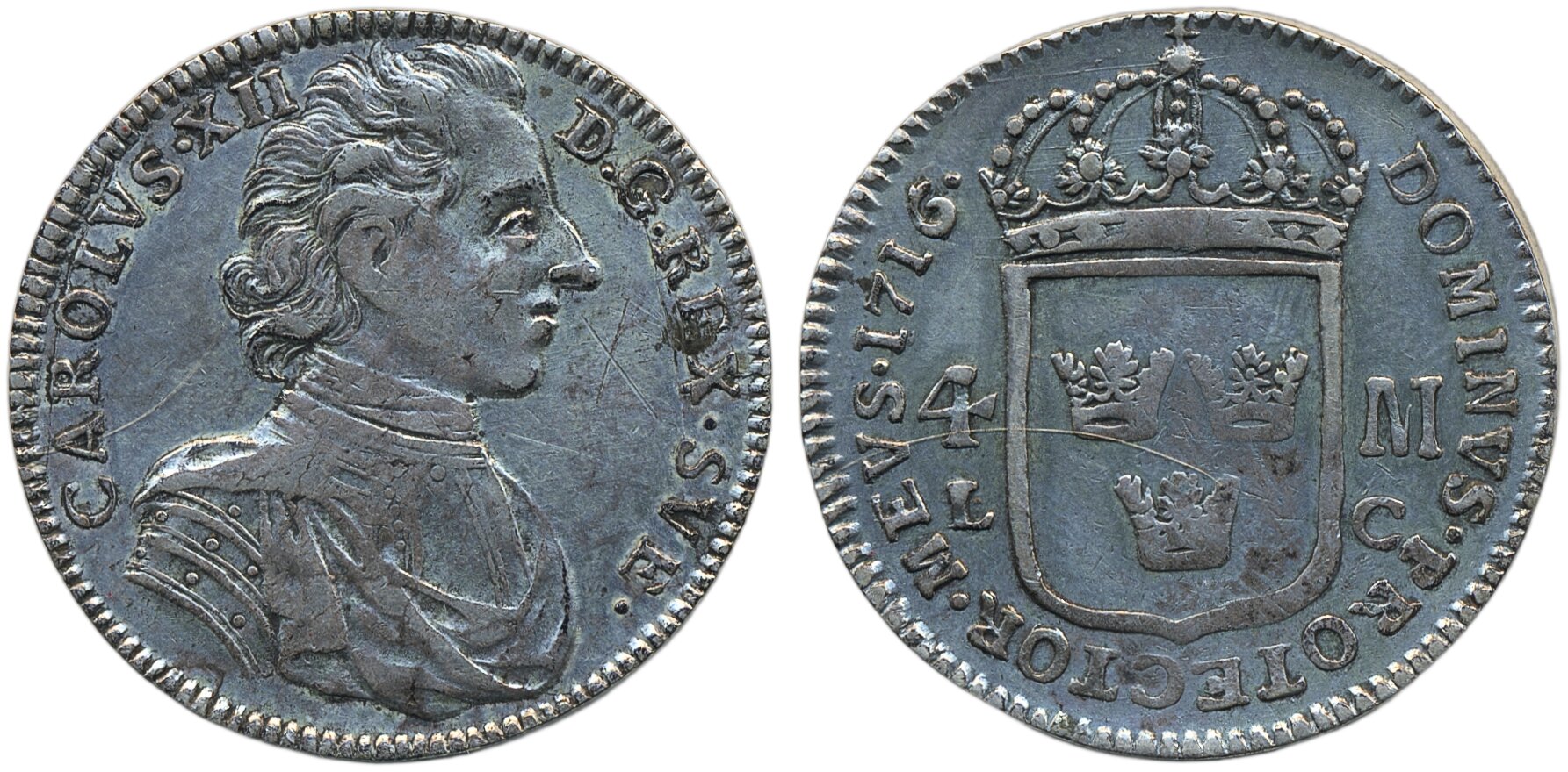 Coins, Sweden. Karl XII, SM 55, 4 mark 1716. 20.65 g. Stockholm. Grafitti in obverse right field. 1+.