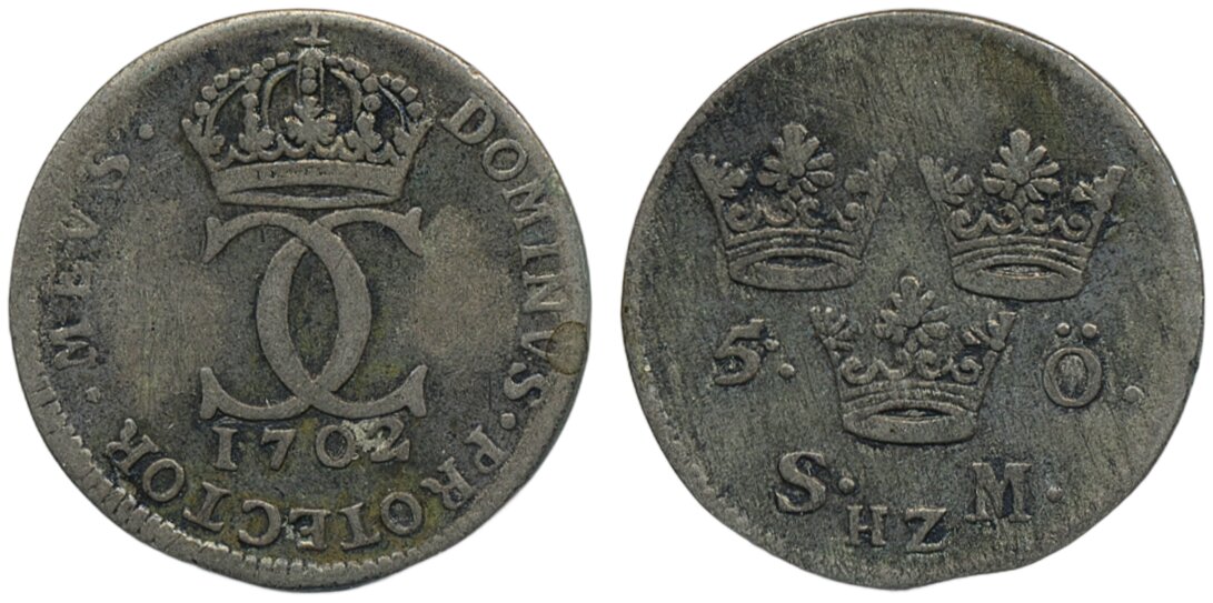 Coins, Sweden. Karl XII, SM 102, 5 öre 1702. 3.42 g. Stockholm. Scarce date. 1/1+.