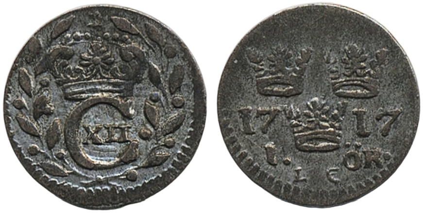 Coins, Sweden. Karl XII, SM 141, 1 öre 1717. 1.25 g. Stockholm. 1+/01.