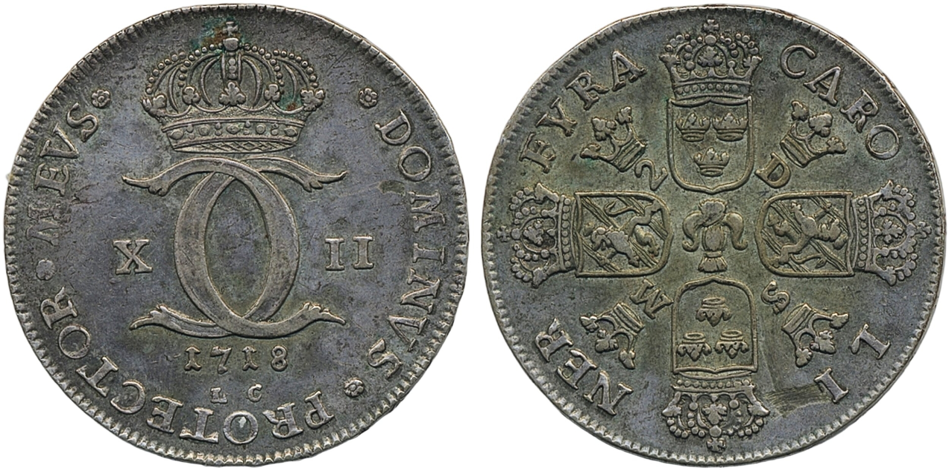 Coins, Sweden. Karl XII, SM 142, 4 caroliner/2 daler silvermynt 1718. 27.31 g. Stockholm. One year type. Minor verdigris. 1+.