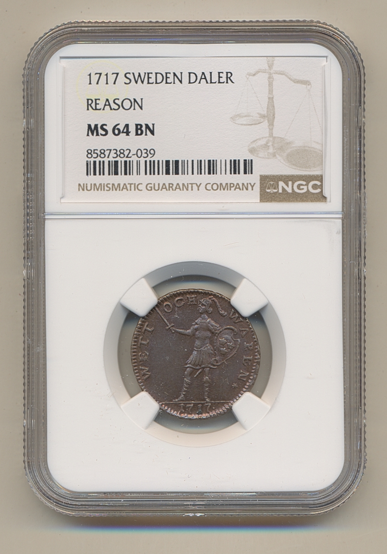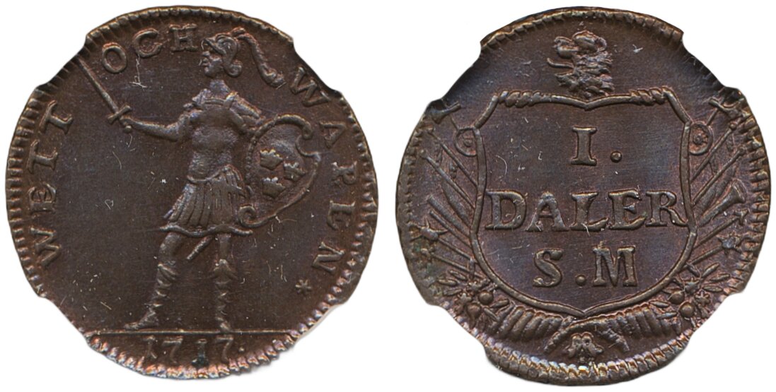 Coins, Sweden. Karl XII, SM 216, 1 daler SM 1717. Emergency coinage Wett och wapen. Graded by NGC as MS64BN a beautiful and lustruous example. 01/0. See certification at NGC