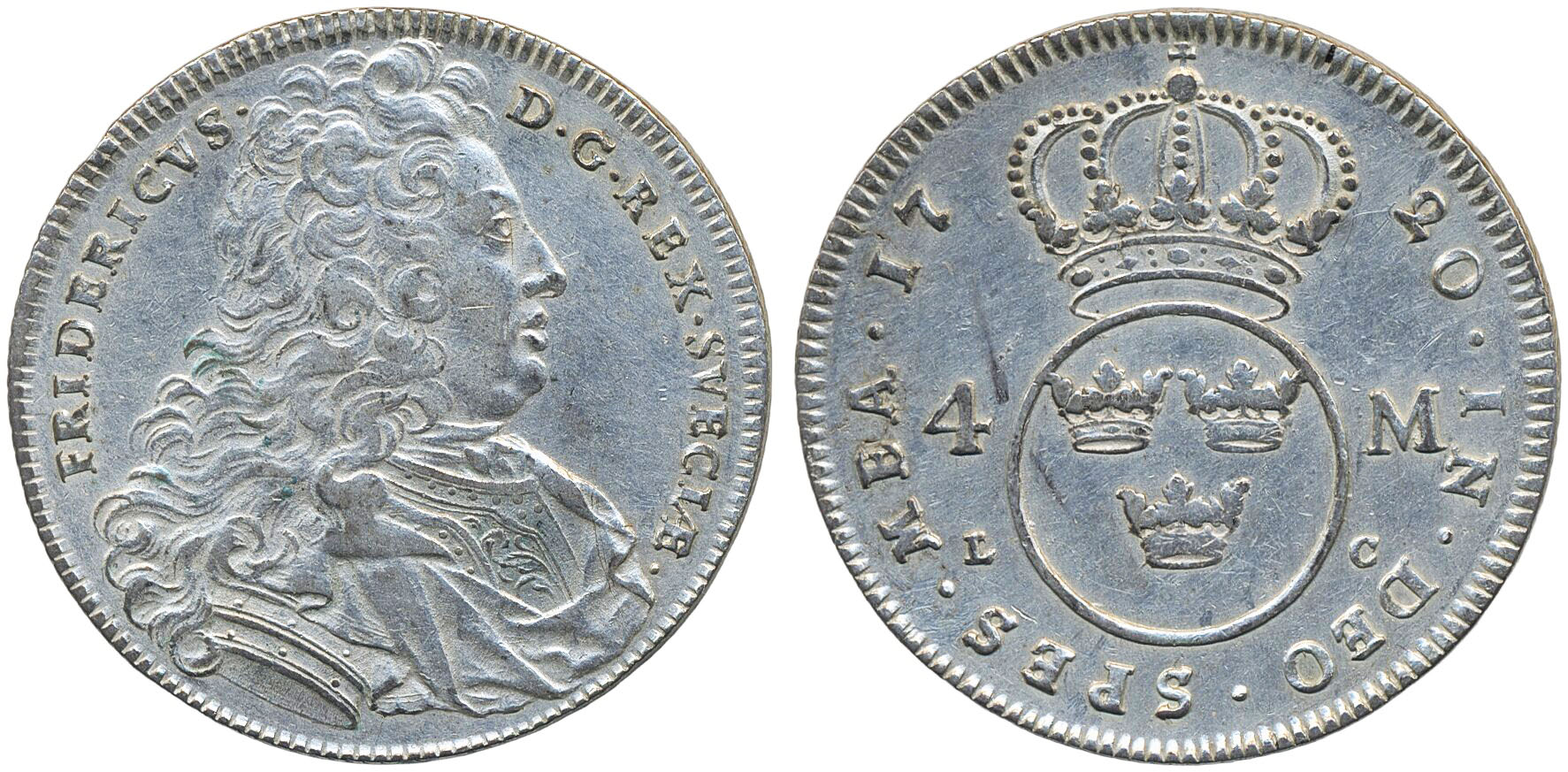 Coins, Sweden. Fredrik I, SM 108, 4 mark 1720. 20.57 g. Stockholm. Cleaned. R. 1+.