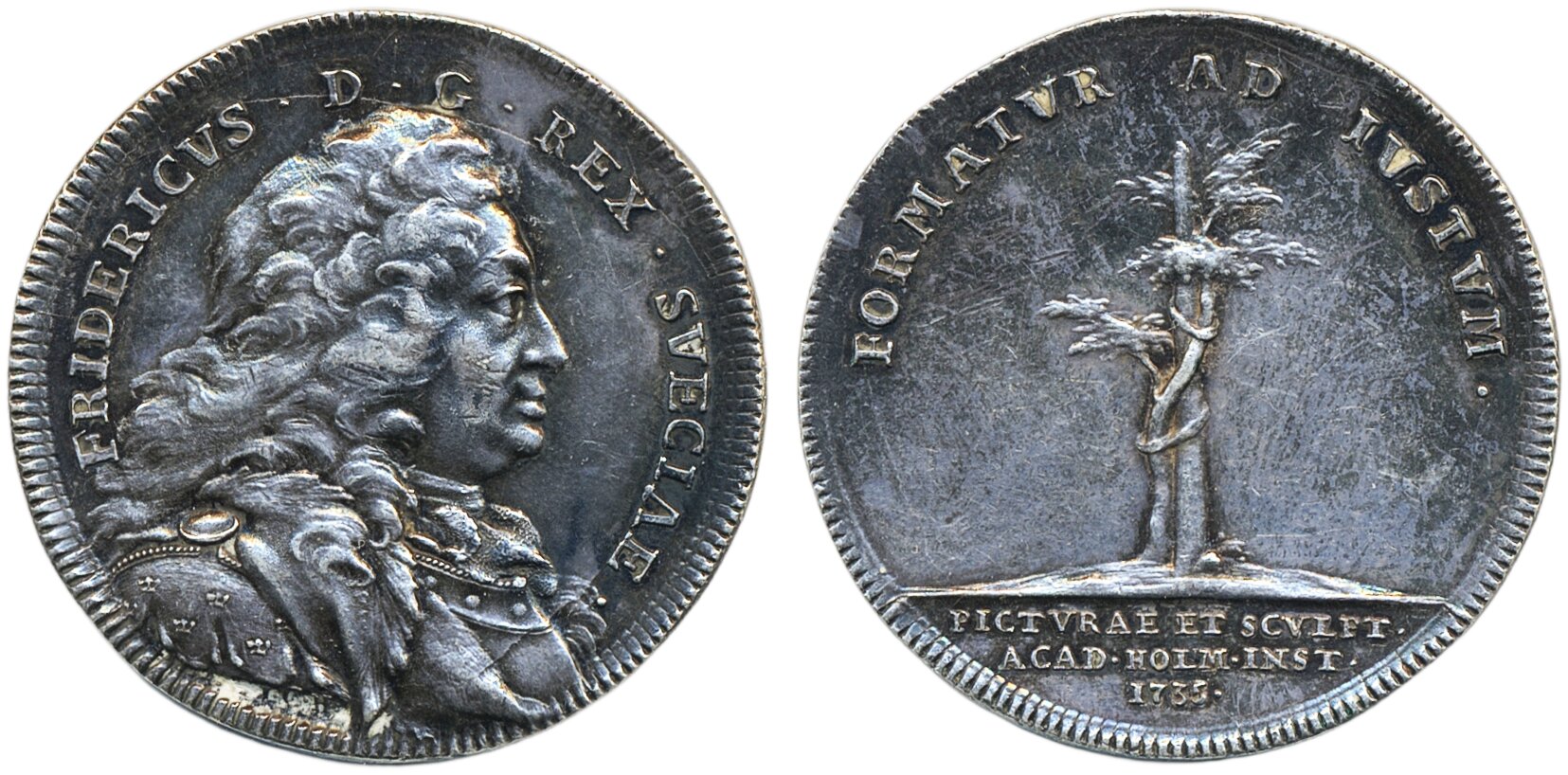 Medals, regal, Sweden. Fredrik I, Hild. 51, Silver medal Royal Swedish Academy of Fine Arts. 1735 (year of foundation), 34 mm, 12.66 g. Reverse lightly cleaned. 01.