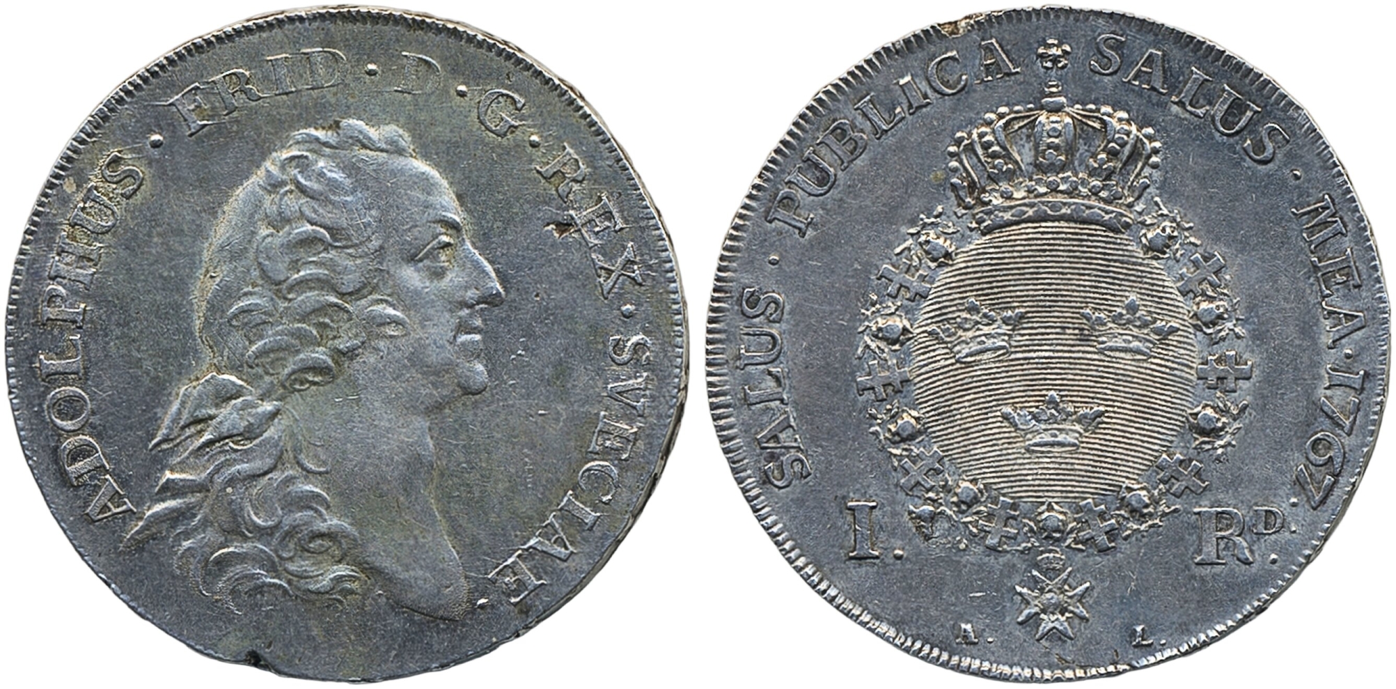 Coins, Sweden. Adolf Fredrik, SM 56, 1 riksdaler 1767. 28.94 g. Stockholm. Planchet flaws. Ex. Nordlind Myntauktion 26–27 November 2011, lot 483. 1+.