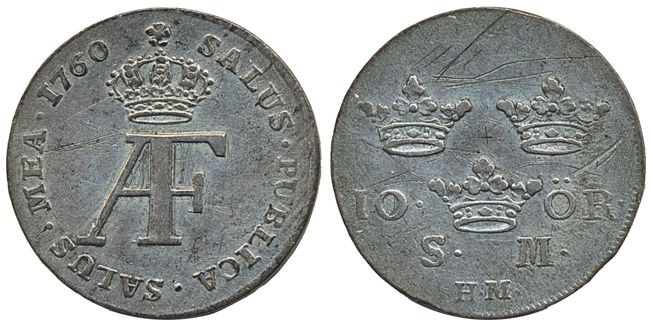 Coins, Sweden. Adolf Fredrik, SM 93, 10 öre 1760. 7.01 g. Stockholm. Scratched. Better date. Ex. Myntkompaniet 22, lot 325. 1/1+.