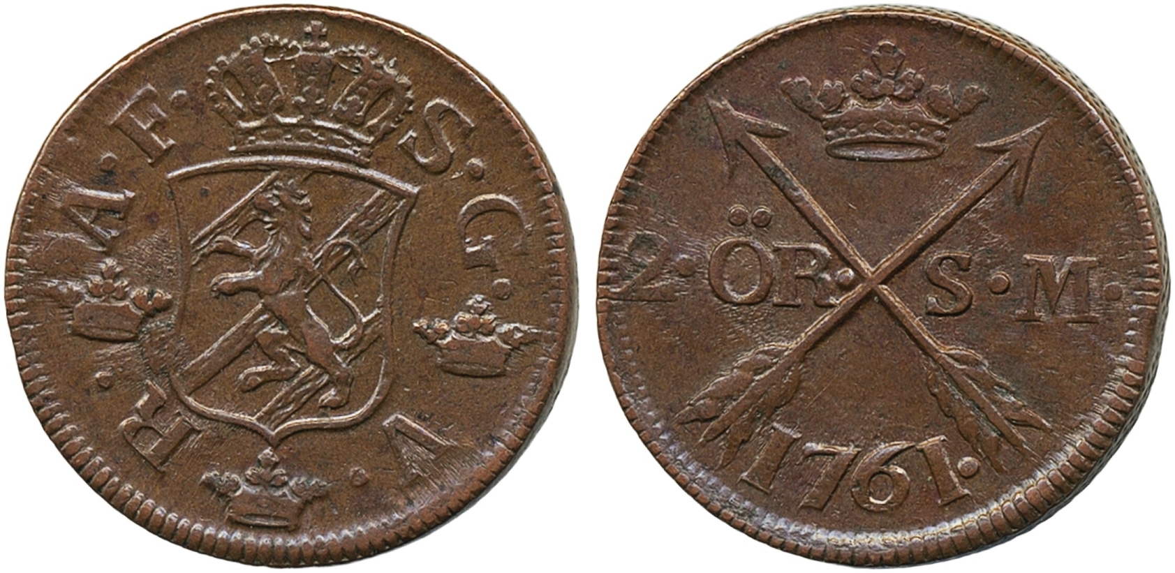 Coins, Sweden. Adolf Fredrik, SM 172, 2 öre SM 1761. 28.38 g. Avesta. Lustrous and attractive. 1+/01.