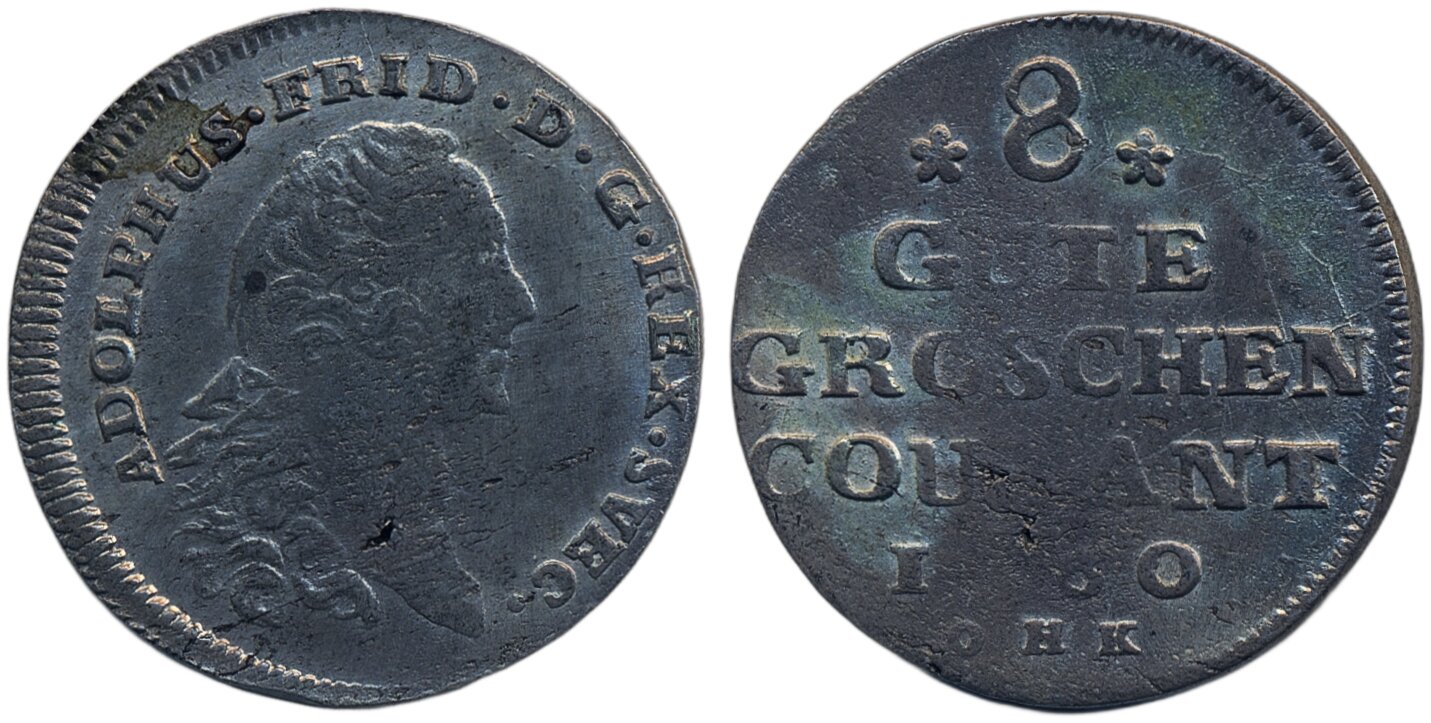Coins, Swedish possessions, Pomerania. Adolf Fredrik, SB 246, 1/3 taler (8 gute groschen) 1760. 6.35 g. Stralsund. Lustrous example, as often weakly struck. SMB 234. 1+/01.