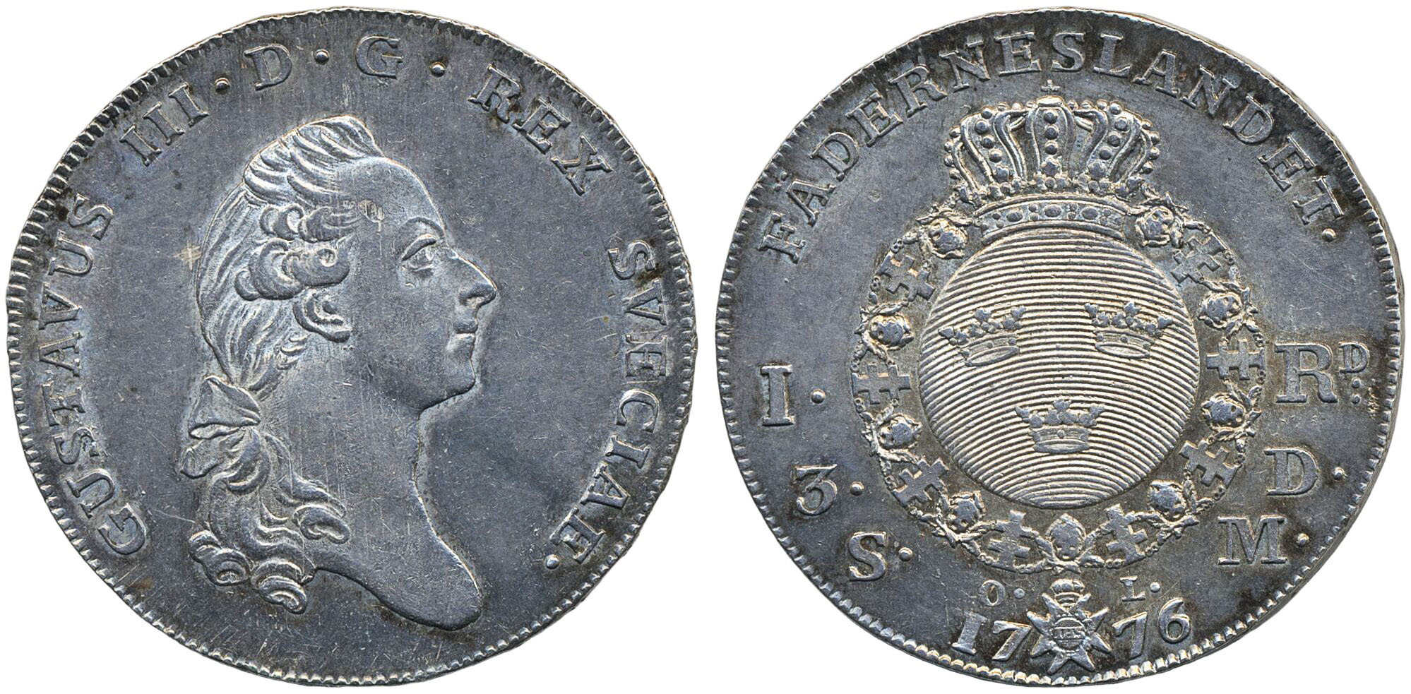 Coins, Sweden. Gustav III, SM 43, 1 riksdaler 1776. 29.14 g. Stockholm. Light hairlines, lustrous. Small cross. 01.