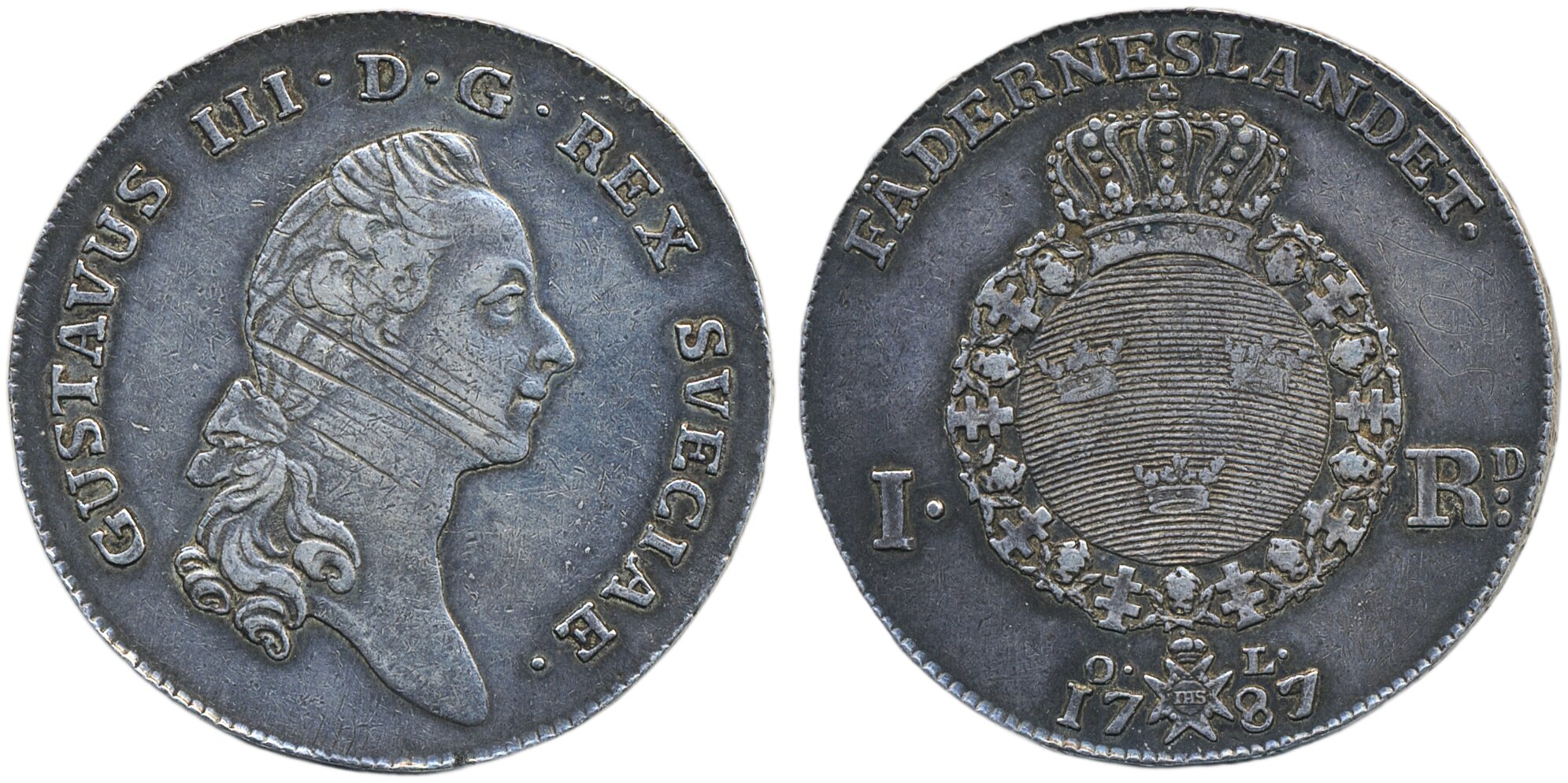 Coins, Sweden. Gustav III, SM 50, 1 riksdaler 1787. 28.93 g. Stockholm. Scratches. 1/1+.