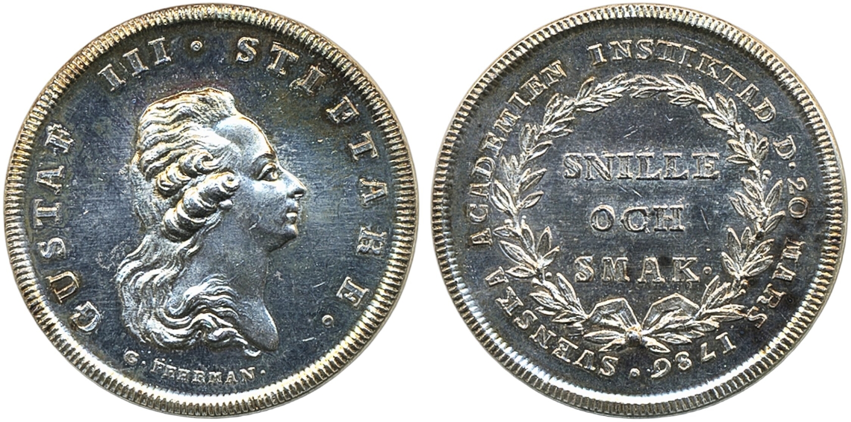 Medals, regal, Sweden. Gustav III, Hild. 110, The Swedish Academy. Medal in silver, 33 mm, 21.58 g., by G. Fehrman. Insignificant small scratches and spots.
