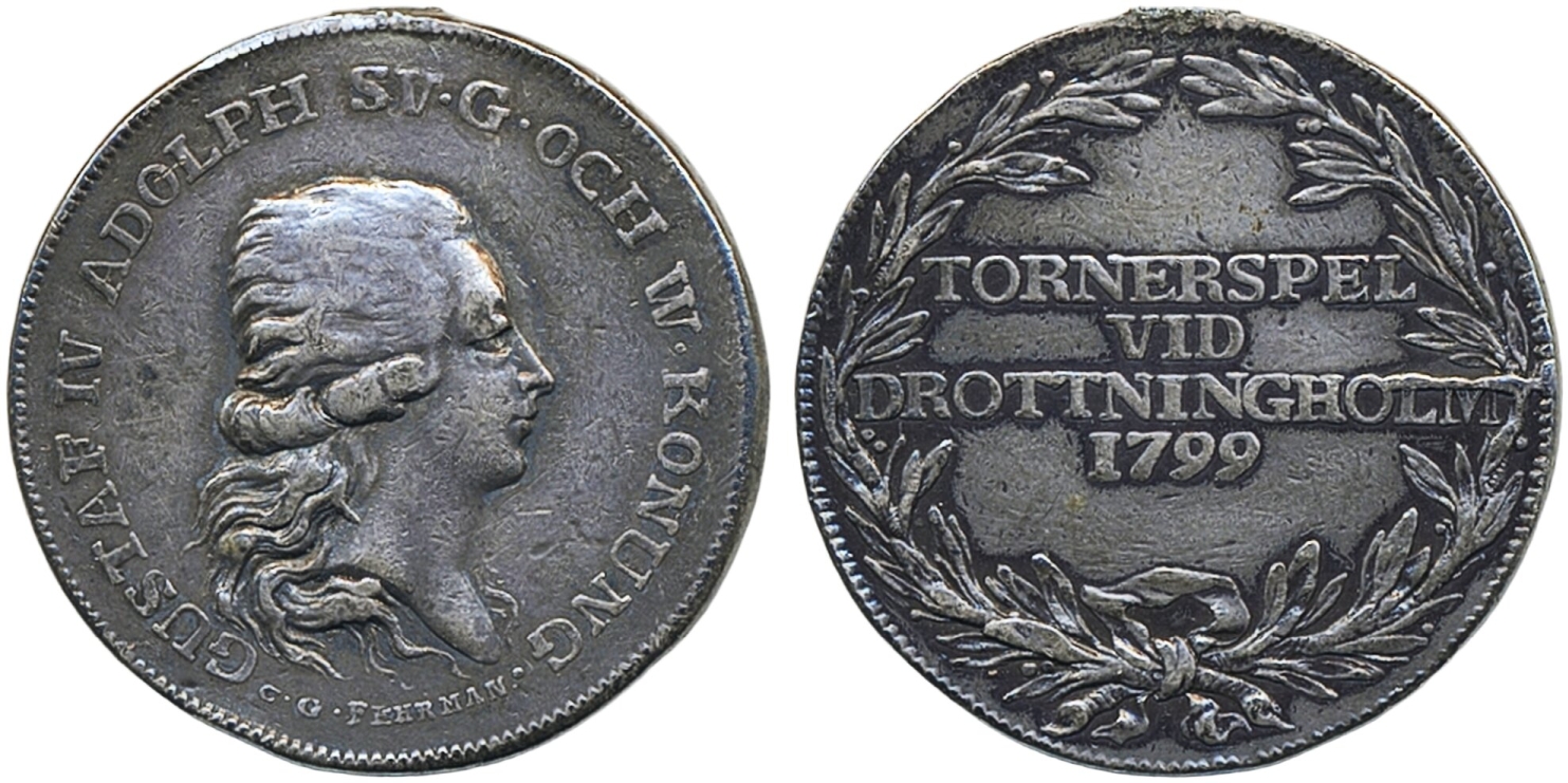 Medals, regal, Sweden. Gustav IV Adolf, Hild. 18, Tournament at Drottningholm 1799. Medal in silver, 30 mm, 13.0 g., by C.G.Fehrman/L.O. Lunderberg. R. Has been mounted. Delzanno 20a. 1.