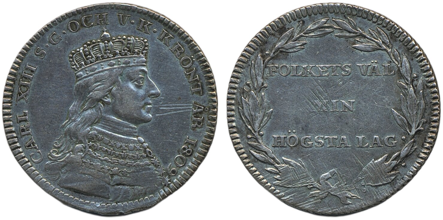 Coins, Sweden. Karl XIII, SM 31a, 1/3 riksdaler (largesse money) 1809. 9.76 g. Stockholm. Largesse money for King's Coronation. Scratches in front of portrait. Reverse adjustment marks. 1+.