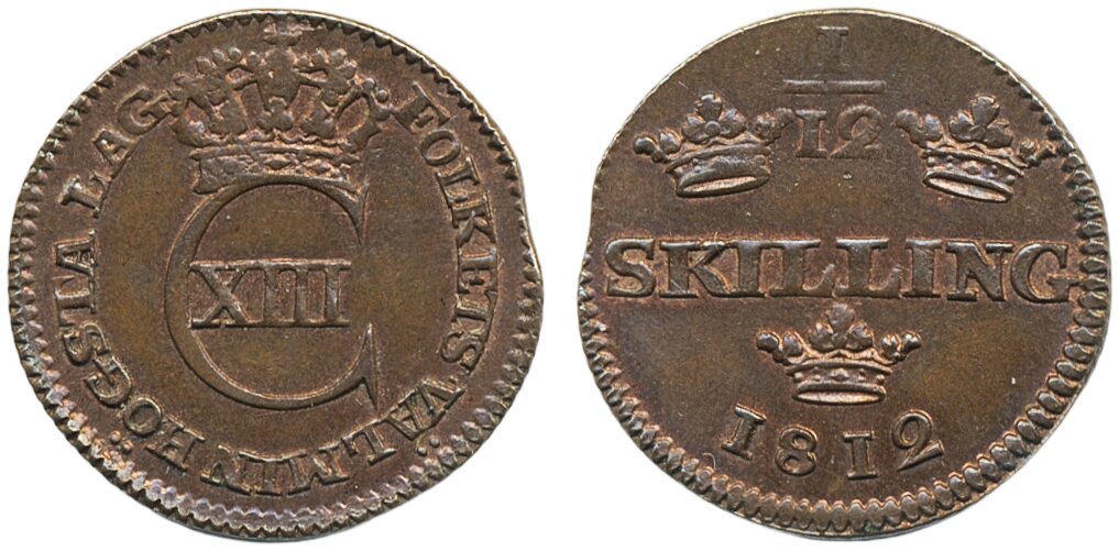 Coins, Sweden. Karl XIII, SM 44, 1/12 skilling 1812. 2.28 g. Avesta. Beautiful lustrous example. 01/0.
