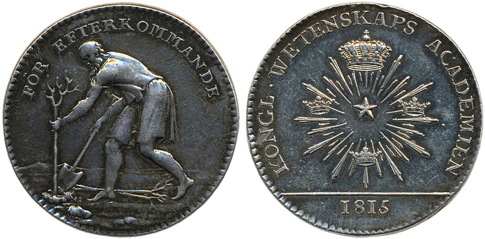 Medals, regal, Sweden. Karl XIII, Hild. 35, Royal Swedish Academy of Sciences. Jetton 1815 in silver, 33 mm, 12.5 g. by M. Frumerie. Small edge nick. Nice rainbow-like patina. Delzanno 41. 01.
