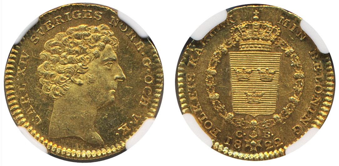 Coins, Sweden. Karl XIV Johan, SM 17, 1 dukat 1822. Stockholm. Sole finest graded by NGC as MS63. 01/0. See certification at NGC
