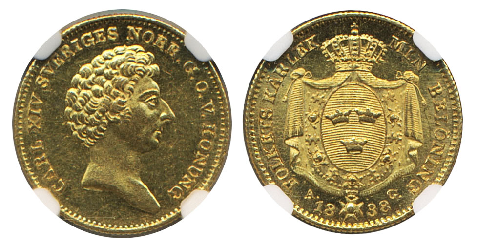 Coins, Sweden. Karl XIV Johan, SM 33, 1 dukat 1838. Stockholm. Graded by NGC as MS62. 01/0. See certification at NGC