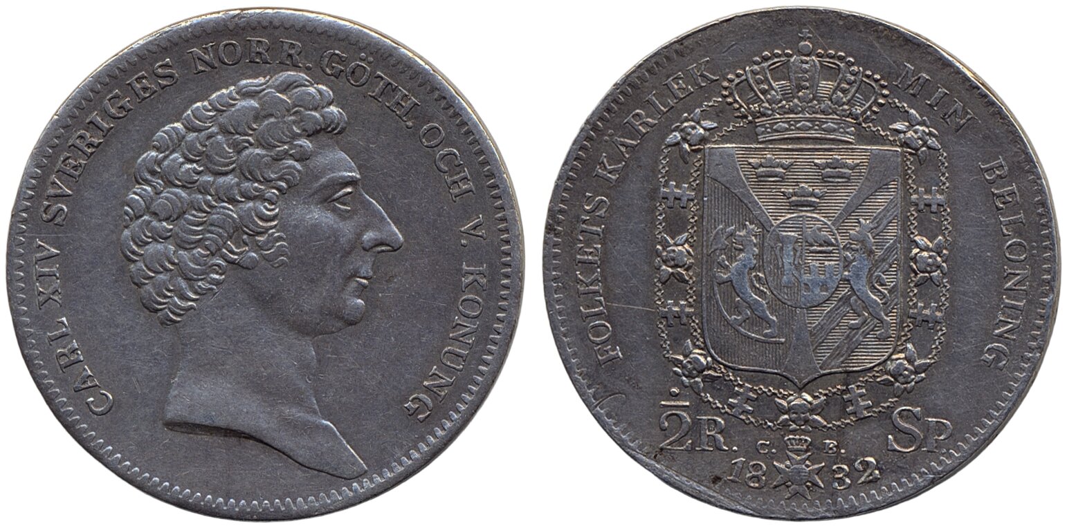 Coins, Sweden. Karl XIV Johan, SM 74, ½ riksdaler specie 1832. Lightly cleaned. 1+.