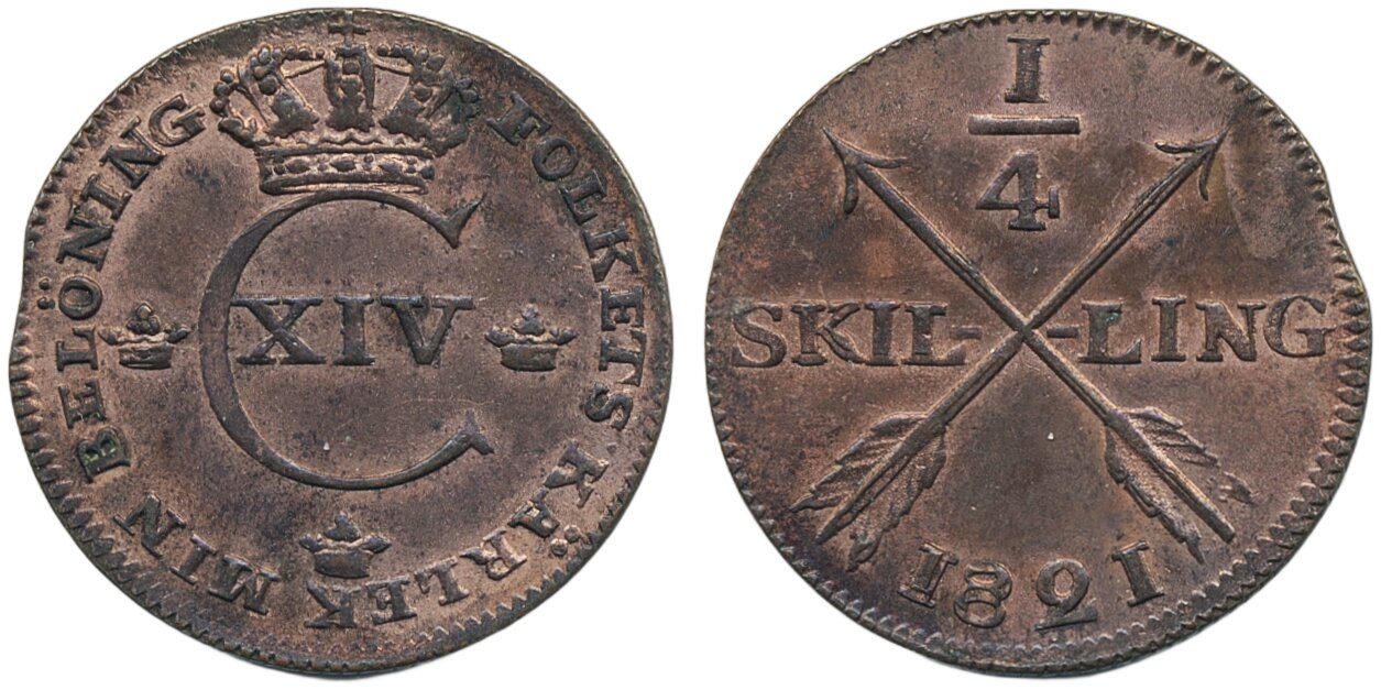 Coins, Sweden. Karl XIV Johan, SM 120, ¼ skilling 1821. 4.13 g. Avesta. Lustrous example. 01.