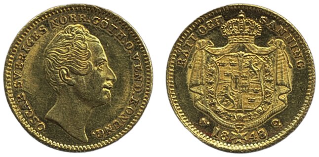 Coins, Sweden. Oskar I, SM 12, 1 dukat 1848. 3.48 g. 1+/01.