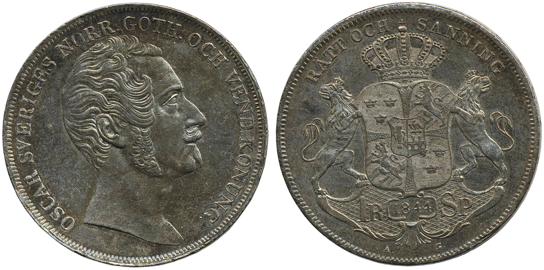 Coins, Sweden. Oskar I, SM 24, 1 riksdaler specie 1844. 01.