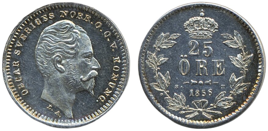 Coins, Sweden. Oskar I, SM 63, 25 öre 1856. Some mirror in surfaces. 01/0.