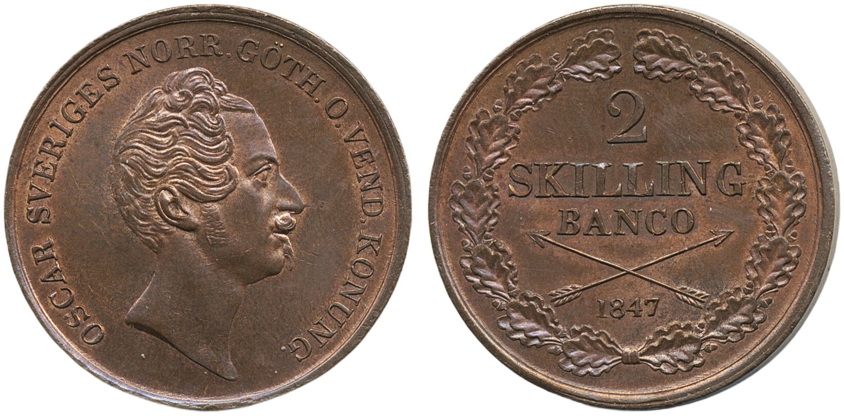 Coins, Sweden. Oskar I, SM 80, 2 skilling banco 1847. 01/0.