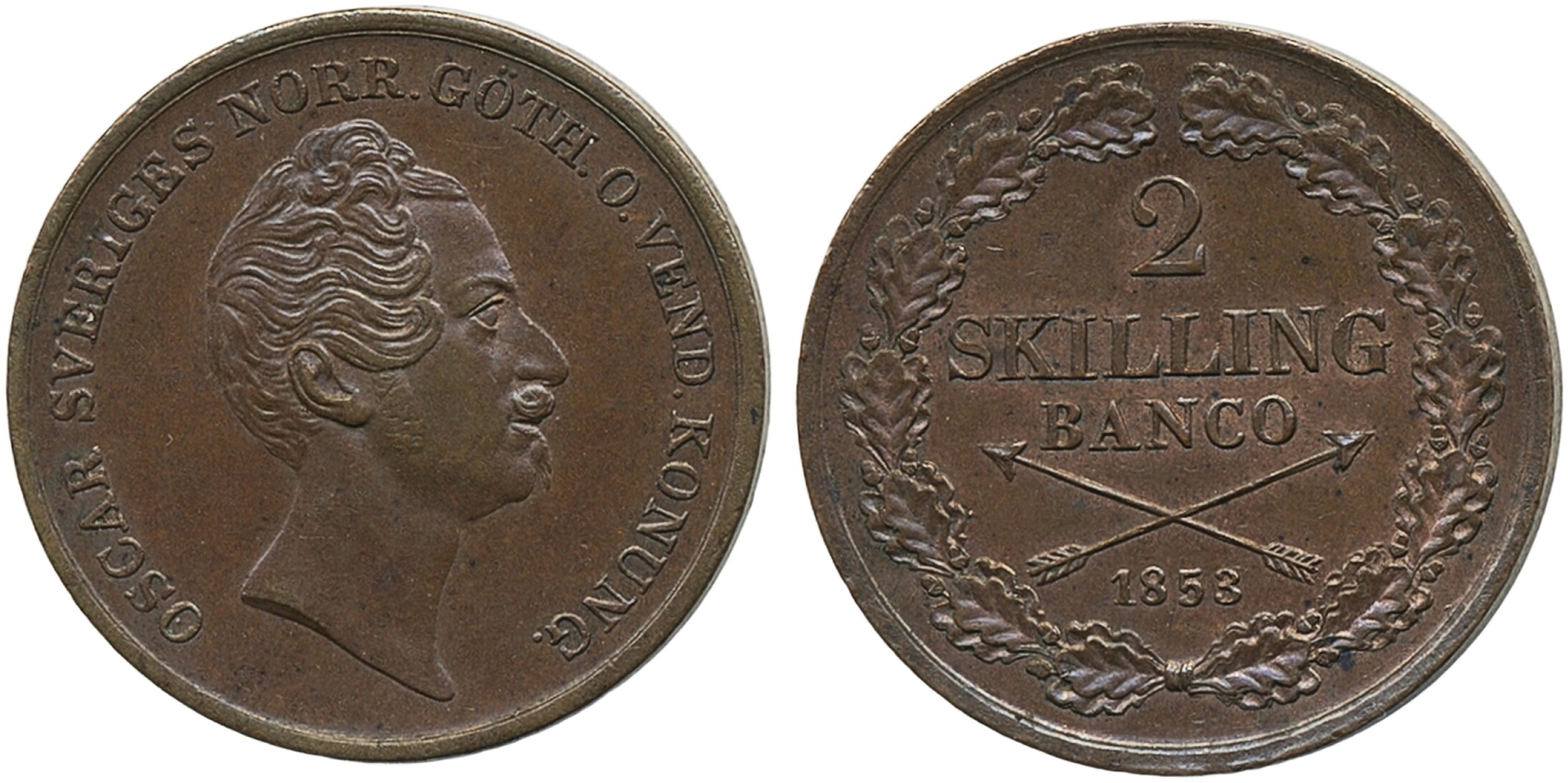 Coins, Sweden. Oskar I, SM 85, 2 skilling banco 1853. 01.