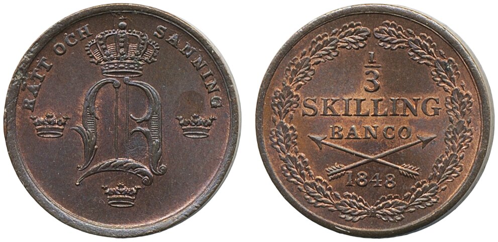 Coins, Sweden. Oskar I, SM 114, 1/3 skilling banco 1848. Die rotation approx. 10 degrees. Interesting mint error. 01/0.