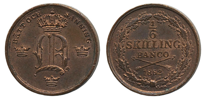 Coins, Sweden. Oskar I, SM 128, 1/6 skilling banco 1852. 01/0.