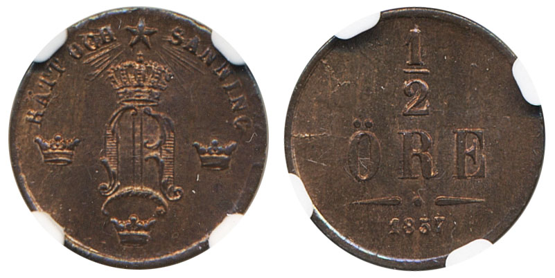 Coins, Sweden. Oskar I, SM 141, ½ öre 1857. Graded by NGC as MS65 RB. Tied highest graded (TOP POP) by NGC. 01/0. See certification at NGC