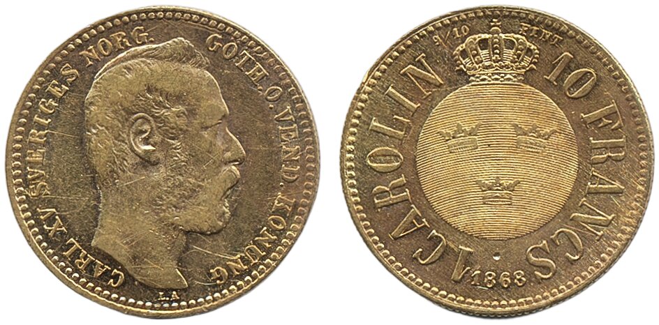 Coins, Sweden. Karl XV, SM 10, 1 carolin 1868. 3.19 g. 1+/01.