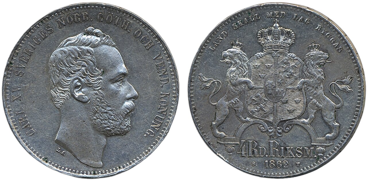 Coins, Sweden. Karl XV, SM 15 a, 4 riksdaler riksmynt 1862. 34.06 g. 1+.
