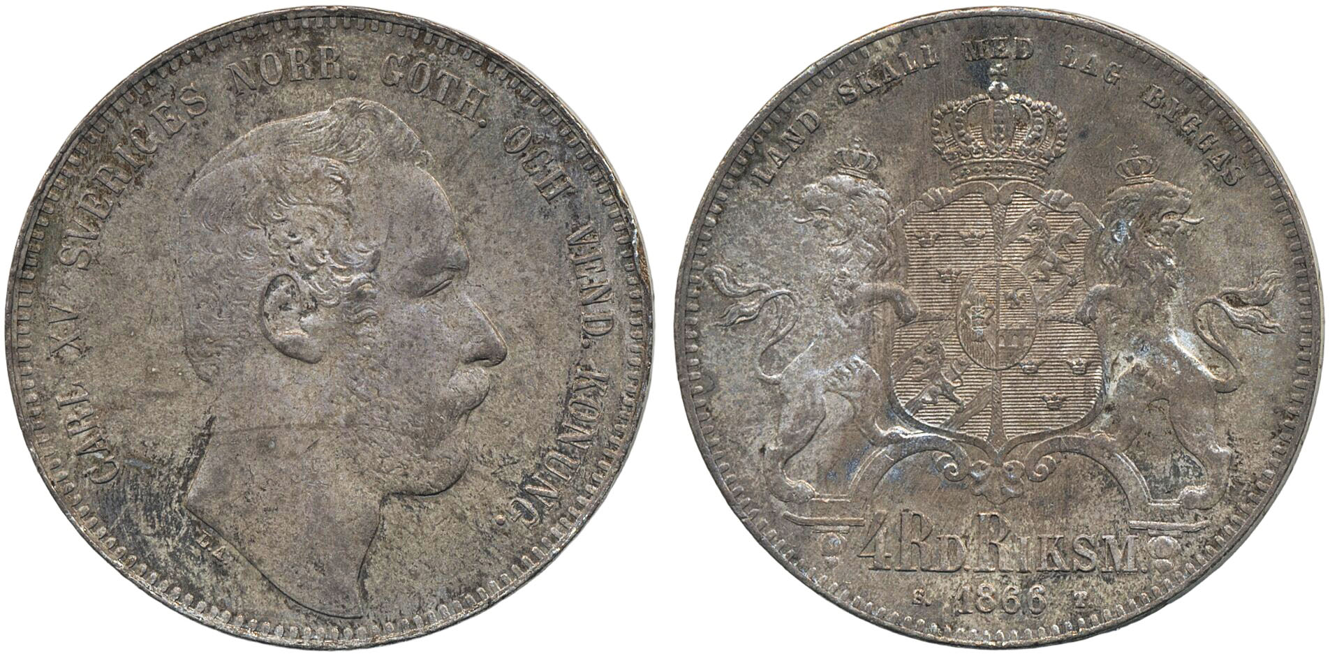 Coins, Sweden. Karl XV, SM 19, 4 riksdaler riksmynt 1866. Lustrous example with underlying lustre, minor rim nick. 01/0.