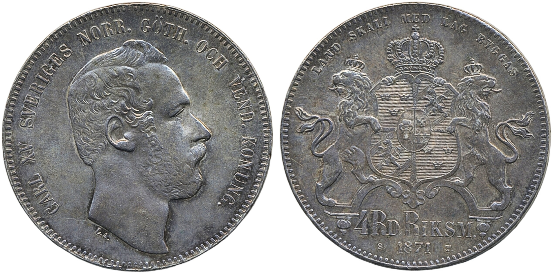 Coins, Sweden. Karl XV, SM 24, 4 riksdaler riksmynt 1871. 1+/01.