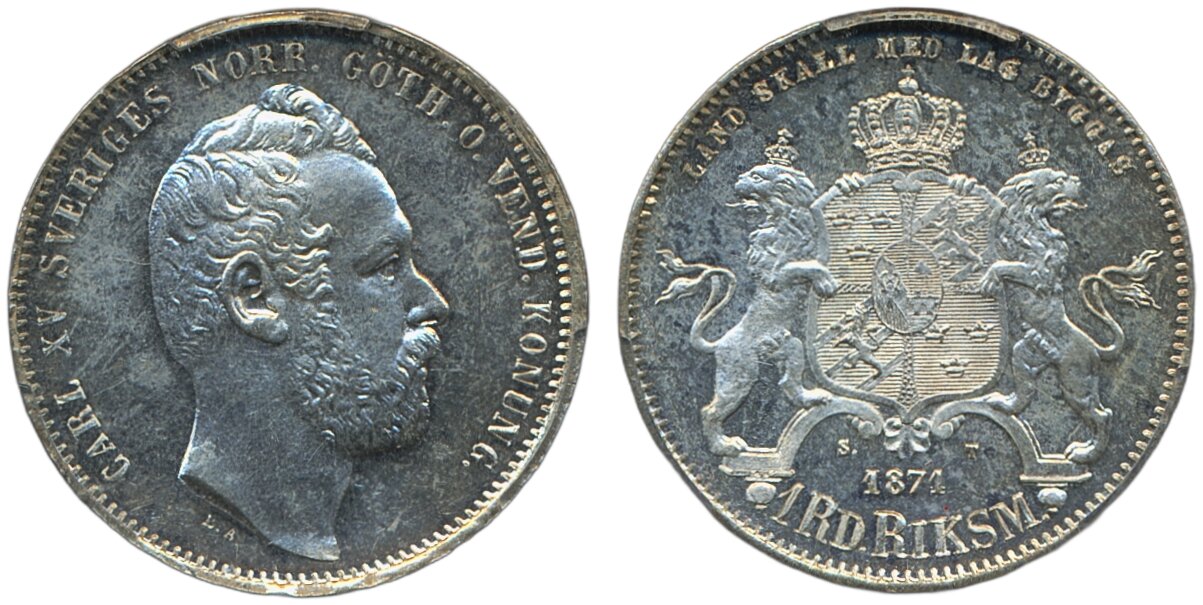 Coins, Sweden. Karl XV, SM 34, 1 riksdaler riksmynt 1871. Proof/mirror surfaces with minimal contact marks. Graded by PCGS as PR64. 01/0. See certification at PCGS