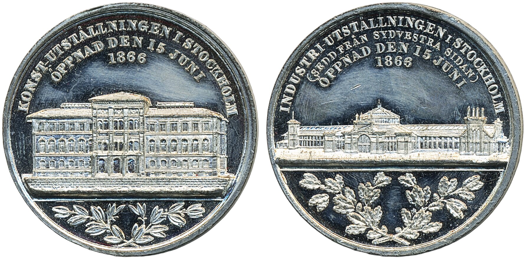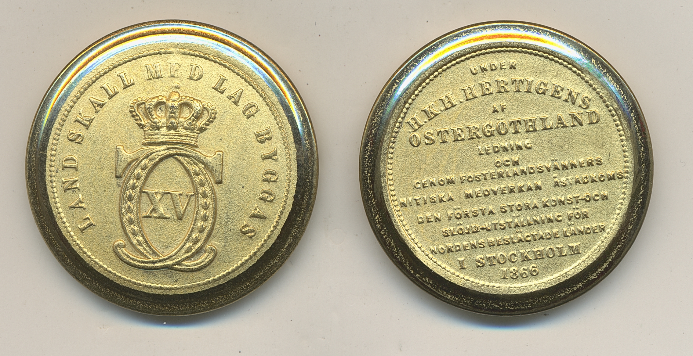 Medals, regal, Sweden. Karl XV, Hild. 14, The Stockholm Exhibition 1866. Medal in tin, 36 mm, 18.74 g., in a brass capsule. Unusually beautiful example. SKM 14. 01/0.