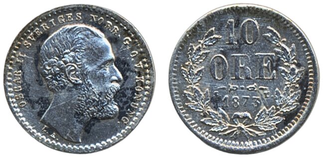 Coins, Sweden. Oskar II, SM 43 b, 10 öre 1873. Upside down A as V. 1+.